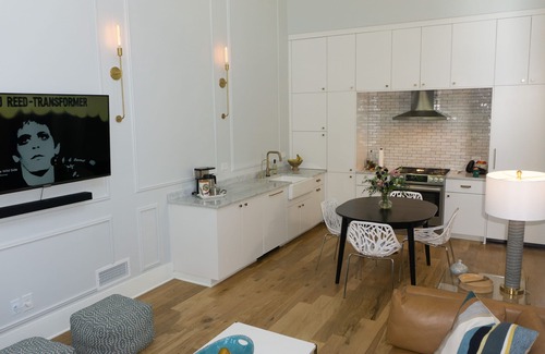 This modern, airy townhome features two story ceilings and custom finishes for a dramatic flair. The 2 bedrooms include king, queen and pull out XL twin beds. It offers wifi and smart TVs throughout, a private backyard, fully stocked kitchen, and whole house water filtration.