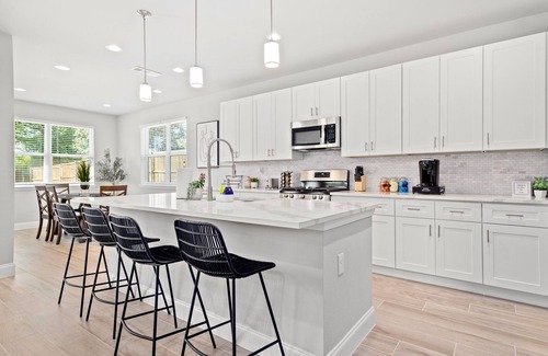 This home away from home features a full size kitchen that won't limit any at-home chef! Take advantage of the full size gas burner stove top and cook up your favorite meals using the provided kitchen utensils! Also included is a toaster, blender, and microwave giving you everything you could need while on your vacation! The kitchen also features basic seasonings, oils, and dishware for your convenience. Take advantage of the provided coffee station and start your day off right with a cup of joe! The oversized kitchen island provides plenty of cooking space to prepare a big feast! Serve up your creative cooking creations on the spacious wood dining table that seats 6 comfortably or on the oversized kitchen island that seats 4!