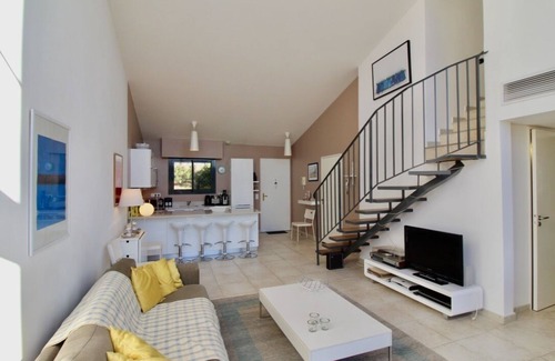 This lovely modern two bedroom, two bathroom house is on two levels. On the ground level there is an open plan, fully equipped, kitchen with stools installed for easy eating but there is also a fold out table to be able to dine inside. In this nice big living area there is a comfortable sofa for four and a TV but also a corner with a desk. The room is bathed in light as there are floor to ceiling windows with direct access to the terrace.