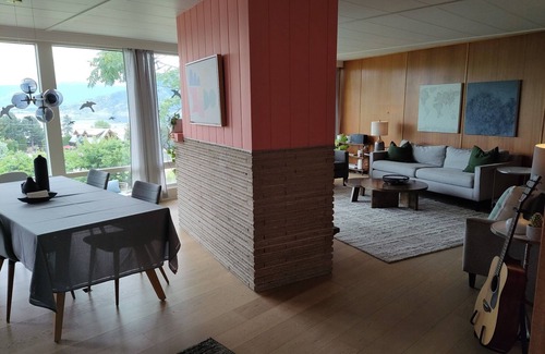 Nestled on a 5-acre organic vineyard, guests enjoy private access to the 3 bedroom, 2 bathroom main floor of our restored 1950s Midcentury Modern (MCM) home with stunning views of surrounding vineyards and the breathtaking Okanagan and Skaha Lakes.