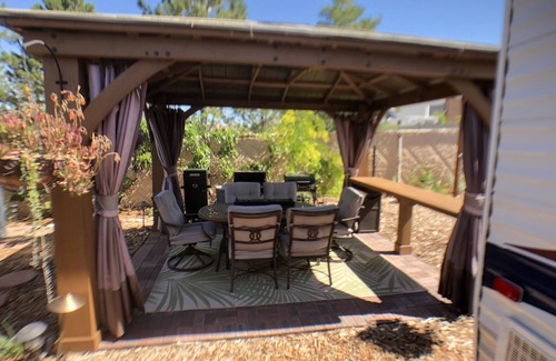 This is not your typical vacation rental. Designed specifically for the traveler seeking a unique lodging alternative for their Albuquerque stay. Enjoy the spirit of RV camping with all the creature comforts of a luxury resort just 15 minutes from downtown, 5 miles from the Balloon Park and 3 miles from the nearest Park and Ride location. This 30-foot travel trailer is located on a fenced and gated one acre compound in the most desirable section of Albuquerque. Nearly every corner of this pollinator paradise is designed to inspire tranquility with over 200 fruiting and deciduous trees, countless flowering plants, koi ponds, and over a dozen garden beds featuring 50+ varieties of herbs and vegetables.