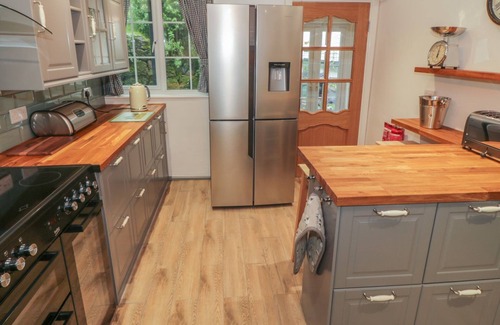 The living areas include a kitchen with an electric oven, ceramic hob, microwave, fridge/freezer and dishwasher, a utility with washer and dryer, and a living/dining room with seating for 12 people and a TV. All five bedrooms have a TV and en-suite shower room, including two king-size, one family room with king-size and double, a ground-floor king-size and a ground-floor twin. Outside, there is a front, non-enclosed garden with furniture, an indoor swimming pool, and off-road parking for five cars. There is a shop and pub within 3.7 miles and a beach within 1.6 miles. Two well-behaved pets are welcome, but smoking is not permitted. WiFi, fuel, power, bed linen and towels are all included in the price and a highchair, travel cot and stairgate are available. Note: No stag/hen parties or similar. Note: Check-in after 4pm, check-out by 9am. For a large property in North Wales by the sea, choose Moel Yr Wyn. Note: This property only accepts check in on a Friday.