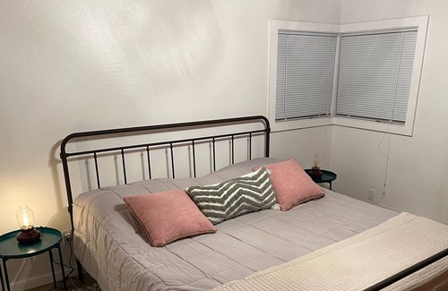 This rustic cabin has modern updates and a full kitchen along with full size washer and dryer. Perched high up in the trees the views from the living room, both master bedrooms and two decks is breathtaking. Walking distance to the river below and private hiking trails above make this an excellent escape. Very quiet with a real wood fireplace, time to snuggle up with a hot tea and a good book. Perfect for writers, artists or couples trying to get away from the hustle and bustle of the city. Also two bunk beds in the kids room that sleeps 4 kids total.