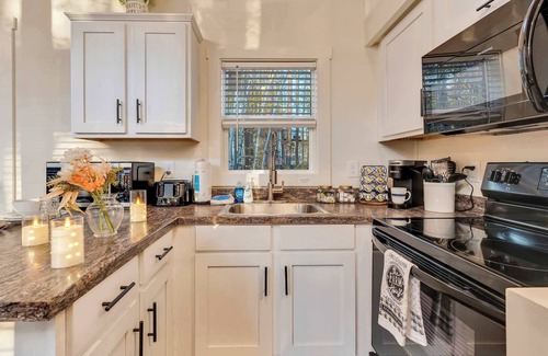 Thoughtfully designed to make the most of its space, this modern tiny home comfortably sleeps up to 6 guests. The main floor features a private master bedroom with a queen bed, along with two custom-built twin bunk beds tucked into a cozy nook—perfect for kids or extra guests. Upstairs, a spacious loft offers an additional queen bed with room to stretch out. With high-speed internet, a comfortable living area for family time, and a well-equipped kitchen, you'll have everything you need to unwind and make lasting memories.