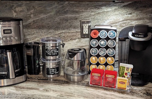 Both living rooms are equipped with fireplaces (gas upstairs and electric downstairs) with cozy seating perfect for relaxing, playing games, reading a book, or watching movies. There are smart TVs and DVD players in both living rooms as well as various paid streaming networks and a healthy collection of DVD movies. In the main level living room, we have numerous games, some reading materials, a Harman Kardon Bluetooth speaker, and a desk if work is unfortunately a must during your stay. The lower level living area has several children's books.