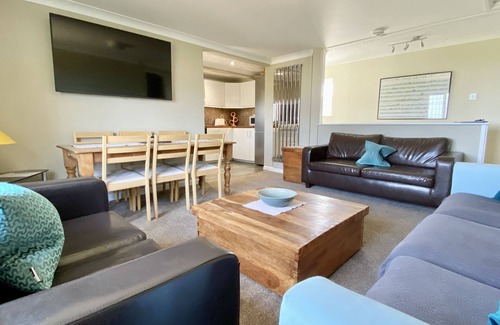 Open plan Living/Dining Room with window providing perfectly framed sea views at Harlyn Bay.