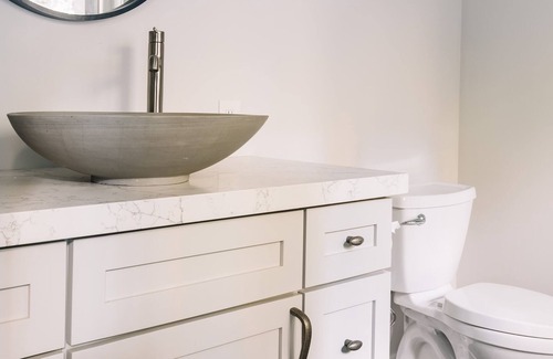 The lower level has a well-designed bathroom, a wood burning stove and heated flooring throughout the lower level keeps you nice and toasty on cold winter days. Enjoy some after dinner cocktails at Mossrock Tavern, your own private bar with granite counters, 60-inch TV, leather sofa and a raised bar top that's perfect for playing bartender!