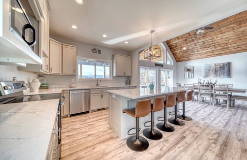 Just completed, this house has everything. Three King size master suites with attached bathrooms and two bedrooms with two twin beds in each. Fully stocked kitchen and an amazing outdoor kitchen too. The views are absolutely gorgeous. The indoor fireplace is electric, but the outdoor fireplace is wood burning. Snuggle up on the outdoor sofa in front of the fire and enjoy the view.
