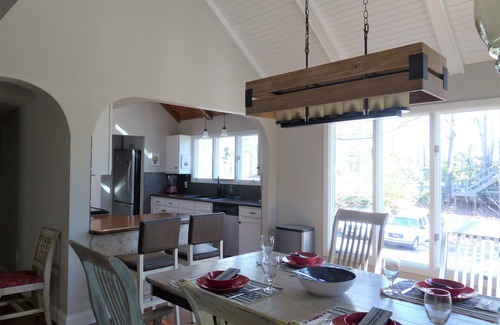 The kitchen is open to the dining area and is well stocked with everything you would need to cook a meal on vacation. The family room features a wood burning fireplace and large flat screen TV. The two second level bedrooms also feature flat screen TVs, and each bedroom has at least one wireless phone charger.
