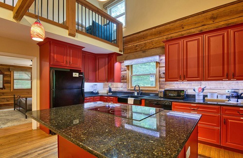 Enjoy the peace and privacy of a picturesque rural setting with the comfort of modern amenities like high speed fiber optic internet and USB charge port lamps. Get cozy with a wood burning fireplace, large flat screen smart TV and plush sectional seating for 6+ in the open main living area.