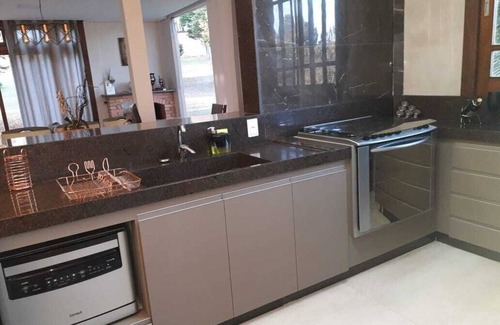 Enjoy the delicious mountain climate. Beautiful house with two rooms, one TV with 70'' and access to Netflix and SKY; and another 50'' smart TV. Living room with fireplace and panoramic glass overlooking the full moon and starry sky. Two kitchens equipped with side by side refrigerator with water and ice dispenser, stove, coffee maker, microwave and airfryer. Steam room with panoramic view and shower room. Heated swimming pool with chromotherapy for night use, The house has a cozy decoration and mountain style. Bright garden with another beautiful outdoor fireplace with benches and swings to enjoy a good wine with the view of the sky. The garden also has beautiful fountains in a classic style to relax with the sound of the water. The house also has a master suite with a whirlpool with chromotherapy and a beautiful view.