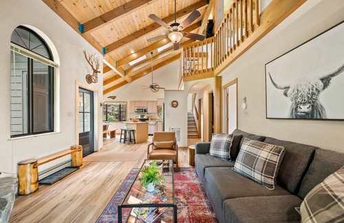The main floor is an open-concept living room featuring soaring vaulted ceilings and exposed beams, a wood-burning fireplace, and HD Smart TV. The living room is adjacent to the kitchen, which offers granite countertops, and stainless appliances and has a center island with a live-edge wood slab top. The dining area accommodates up to eight (8) guests. The den, off the living room, offers a second area on the main level to relax and entertain. It features many windows allowing in natural light and the mountain view. The den has another HD Smart TV and ample comfy furniture. A sleeper sofa on the main level can sleep two (2) more guests. There is a hallway half bathroom on the main level as well.