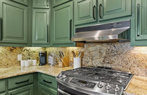 A breathtaking view and flood of natural light greet you on the main level where the family room, dining room, kitchen and sunroom create a vast open floor plan. Guests will enjoy plenty of comfortable seating in the Family Room with a large, stacked stone wood burning fireplace for the authentic mountain experience. Gather around the huge dining table to eat, do puzzles, or catch up with loved ones. Lounge in the sunroom on the oversized, plush sectional sofa to read or watch the brand new large screen smart TV. The kitchen provides charm and everything you need to create the perfect Thanksgiving Feast or just heat up your leftovers for a low maintenance meal. There are also two expansive decks and a screened dining area to be able to enjoy the spectacular view while you gather around the firepit or relax in the swinging chairs.