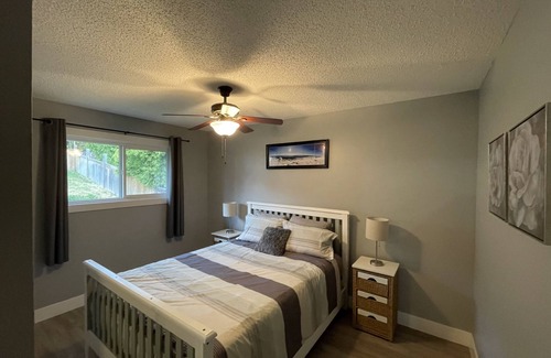 Cosy upper floor of house in Black Mountain on the outskirts of Kelowna with beautiful mountain and orchard views. Five minutes to all amenities. Three bedrooms, sleeps 6. Has everything required for a family and friends location. Plenty of parking. Under cover deck. Outside deck with yard for your relaxation. There is also a BBQ. Close to Black Mountain Golf Course. Various wineries within driving distance and the Okanagan Lake is also a short drive away.