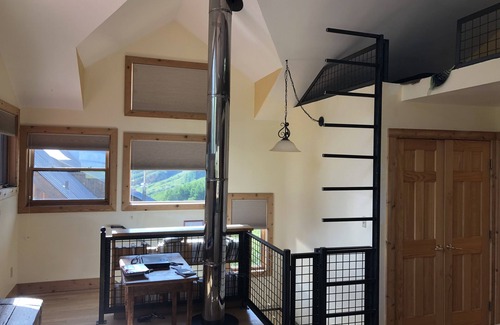 A spacious upstairs with dormer ceilings was added in 2001, with an office/den, a loft reached by custom steel ladder, and a master BR/bath suite. The den has a desk with amazing views through 13 (count 'em) windows, a propane fake-wood stove, double sleeper sofa, half bath, and mini-kitchen with small sink, microwave, and mini fridge. The office has an L-shaped desk, brand new wireless printer/scanner/fax and a 32' LCD TV. The master BR suite is bright and airy, with a huge window looking down valley towards the Wilson Group of 14ers, and a spacious bath with 2 sinks, partly enclosed shower (with a window of course), and hot tub.