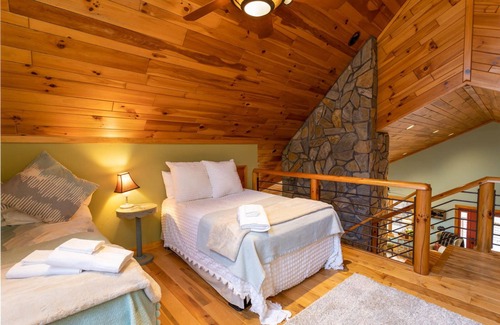 The main floor features a comfortable king master suite with a large TV and private bathroom. A small sleeping nook with a twin-size cot and window is through the bathroom. The private bathroom has a sink, vanity area, and step-in tub shower combo. Up the beautiful wooden stairs from the living room is a delightful open loft with two double beds, A-frame windows, and a private bathroom with shelving and a step-in shower. The lower level of the home features a king bedroom with a TV and a queen bedroom with a TV. Both rooms are thoughtfully decorated with comfortable beds, pillows, and blankets.