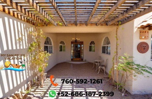 Soaked in sunshine and perfect for your next vacation. Located in El Dorado Ranch this two-bedroom home blurs the line between indoor and outdoor living and is the perfect place to experience San Felipe.To get here, driving from the U.S, you would drive South on San Felipe - Mexicali Highway 5 to the KM 176 marker.The desert-inspired landscaping is open and inviting and leads you right into a front courtyard. This outdoor lounge space has pockets of sun and shade and is the perfect place to enjoy lunch with a clear sky view.
