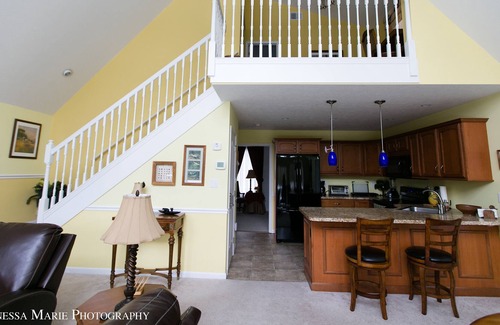 PRICING AND ACCOMODATIONS Upper level: Master bedroom with full bath and queen bed on first floor w/washer/dryer. Second floor has 2 Bedrooms , both with queen beds and also a loft with two single beds, (trundle). There is a full bath on second floor. There are large cathedral windows facing the pond. THIS ARRANGEMENT SLEEPS 8.