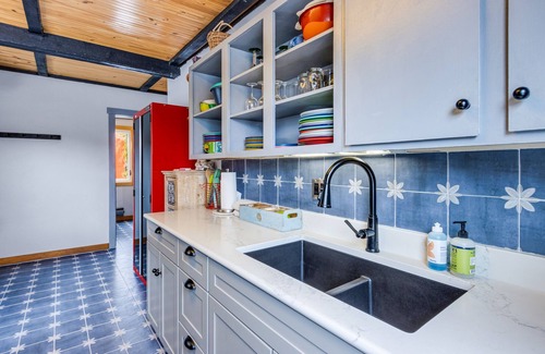 It's a warm and inviting space with tile and wood floors, natural wood ceilings, and plenty of windows throughout. Enter by way of the fully appointed kitchen (no dishwasher) and move into the living room, where you'll find a comfortable sofa, a small dining table, and a smart TV (guests must log in using their own accounts) to watch in the warmth of the wood-burning stove. A private balcony is just through the sliding glass doors, where you can sip your coffee, enjoy your breakfast, or browse the free WiFi in the shade.