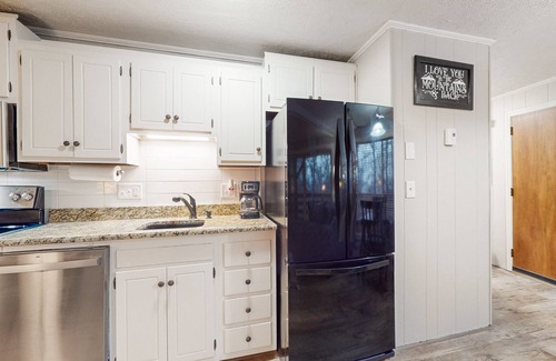 Upon entering, you will be greeted by a welcoming open floor plan that opens onto a covered balcony with tree-lined winter views. Cozy up around the wood-burning fireplace for some downtime watching a fun show or movie on the TV, playing board games or cards, or planning your next adventures. When mealtime comes, surprise your guests with a delicious homemade treat or meal prepared in the well-appointed kitchen. The main bedroom features carpeted floors, a TV, and a desk.