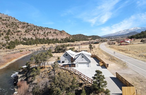 Find your outdoor bliss at this amazing mountain-view retreat directly on the Arkansas River. Featuring a beautiful main house and a charming studio cabin, this quiet hideaway offers plenty of space for your next group getaway.