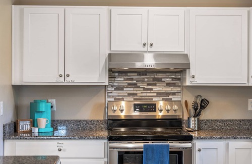 - Full kitchen with a stove, dishwasher, coffee maker (K-cups), microwave, and refrigerator, and every kind of pan/bowl/utensil you can think of