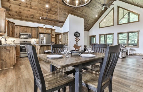 Enjoy your meals at the dining table set beneath a modern chandelier—or take it outside to the screened-in porch for a peaceful dinner surrounded by nature and the soothing sound of the creek.
