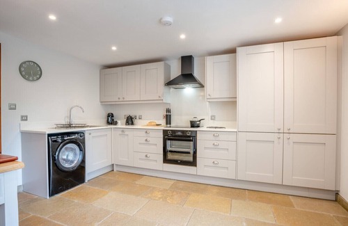 Entering this fresh and airy property, the entrance hall leads through into the pretty U-shaped open-plan lounge/kitchen/diner. The colourful lounge is an ideal space to unwind in, with a Smart TV, comfortable seating, a lovely wood burner and light streaming in from the wall-length windows. To the side is a sociable central dining area, leading round to a stylishly organised and fully equipped kitchen. The ground floor also has a separate WC. Heading upstairs you will find two light and cheery bedrooms, each with a TV and en-suite facilities. The cosy king-size room has its own shower room, and the bright and relaxing twin has a refreshing, beautifully tiled bathroom.