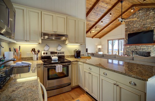 The living room, dining room and kitchen are all centered around a large, new gas fireplace. The living room features a new sectional couch, a desk area for those looking to work while on their getaway (fast WiFi), and a 60" tv. The dining room has a large kitchen table, accommodating 8 people. The kitchen is very well equipped with stainless steel appliances.