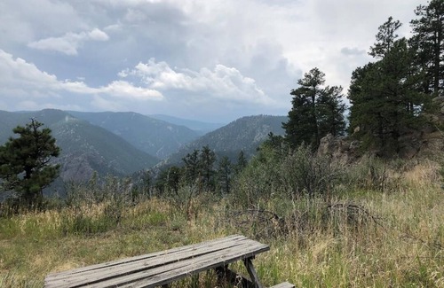 Classic wood log home with modern amenities and gorgeous mountain views. Find privacy, peace and tranquility on this private 10 acre wooded property bordering Roosevelt National Forest. Close to Estes Park and Rocky Mountain National Park. Full kitchen & bathroom. Two bed loft bedroom perfect for the kids while the parents share the first floor master bedroom. Relax with stunning mountain views from the large elevated back deck.or take a hike up Pallisade Peak from the backdoor.