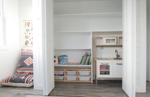 The large open living space is accented by high ceilings and white shiplap walls creating a bright and airy ambiance throughout. It is a real holiday house, with many spots and nooks to press pause and enjoy in.