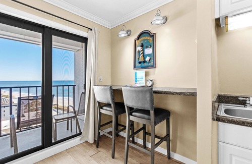 Enjoy a spectacular view of the ocean from this efficiency condo with a queen size bed, a queen size sleeper sofa bed, wood floors throughout, full size refrigerator, oven, microwave and more.This tower ocean view studio condo features a queen size bed and a queen sleeper sofa. It also has a flat screen television in the living room, and a fully-equipped kitchen and private balcony with a gorgeous view of the ocean and coastline.