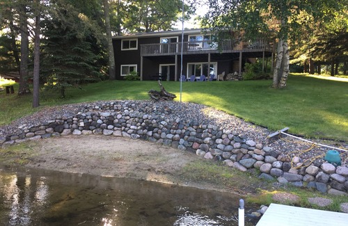 Our rambler, walk-out lake home has a Master bedroom on the main floor with a king-size bed, and the second bedroom on the main floor has a queen-sized bed. The third bedroom, located on the walk-out level contains a queen-size bed. The final bedroom on the walk out level is furnished with two twin beds. Bathrooms are located on both the main and the walk-out level of the home.
