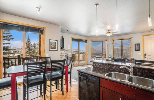 The open living area features a comfy queen sleeper sofa, gas fireplace, flat-screen TV and beautiful mountain views. The kitchen is well-equipped with full-size appliances, a dining table that can seat six and everything needed for quick and easy meal prep. The stacked washer and dryer are located in a closet off of the kitchen.