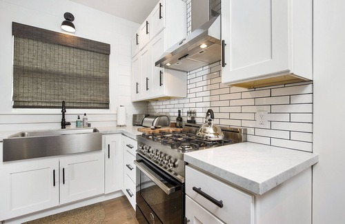In the main house, you will find 2 bedrooms and 2 bathrooms. The kitchen is fully equipped with appliances including a Bertazoni oven and range, farm sink, and a custom butcher block island which is the perfect place to gather with your family and friends for a wine and cheese spread!