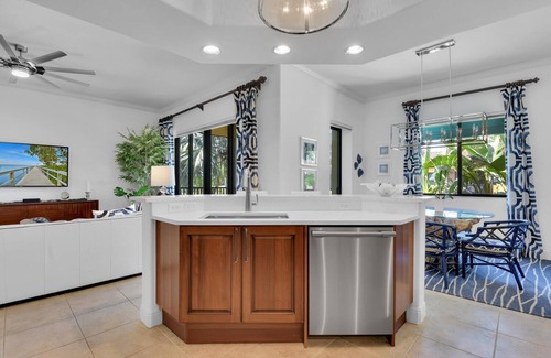 Experience the best of Naples in luxurious coastal style! This newly updated and impeccably furnished condo in the Cottages at Naples Bay Resort includes access to the world-class Naples Bay Club amenities and is ideally located on US 41 adjacent to historic Tin City and 5th Avenue South. Our quoted rates include all resort registration and daily resort fees - so please compare carefully against other similar rentals! You will NOT be responsible for any additional fees to pay on site when you book this unit but with some other units in the complex, you will have to pay those separately. This is a premium unit with higher quality design, furnishings and finishes than many others in the complex. If you are picky and seeking a contemporary luxury caliber condo, this one is for you! Within the condo, Unit I-205 in the Cottages, you will find a nautical navy blue and white color palette across tasteful designer furnishings that complement the waterfront lifestyle that this property offers. A fully equipped and spacious kitchen opens to the living room and dining room. The screened and covered balcony offers views of the lushly landscaped area outside and is furnished with a sectional sofa - perfect for enjoying the balmy breezes flowing in off of Naples Bay. The master bedroom has a King size bed and en suite bath with dual vanities, a soaking tub and separate walkout shower. The guest room has a queen size bed and the guest bathroom has a tub/shower combo. The condo is equipped with a full suite of white linens, sanitized fresh for each guest. The bedroom carpet is of a luxury quality and was replaced in 2021. The unit sleeps 4 people in beds, however we can accommodate up to 6 guests with use of a luxury quality queen size air mattress that is provided. The living room sofa is not a pull-out/sleeper. All guests staying in the condo and listed on your guest list may enjoy access to the Naples Bay Club, which includes the following: - Pool complex with a zero entry free form pool with waterfall, hot tub, lap pool, lazy river, and separate adults only pool and hot tub. Cabana rentals are available. - Poolside bar and dining - State of the art fitness center with class schedule - Full service spa - Tennis center - Marina offering boat rentals - Additional on-property restaurants in the marina area including Bonefish Grill, Nosh, and Cafe on the Bay