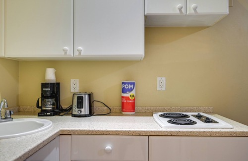 KITCHEN: 2-burner stove, mini fridge, microwave, drip coffee maker, dishware/flatware