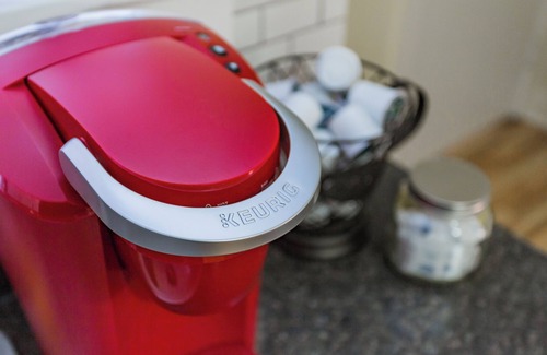 • Fully equipped kitchen with cookware, utensils, full-size refrigerator, and complimentary coffee, cream, sugar, and bottled water