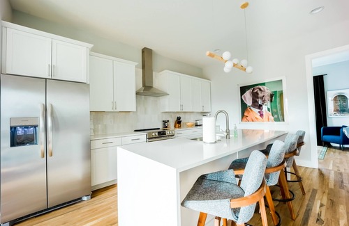The open-concept living space is designed for both relaxation and entertainment, offering a bright and inviting atmosphere. The cozy living room, with its plush seating and stylish decor, is the perfect spot to unwind after a day of exploring Nashville, whether you're catching up on your favorite shows on the Smart TV or simply enjoying quality time with friends and family. The fully equipped kitchen features sleek stainless steel appliances and ample counter space, making it easy to prepare everything from a quick breakfast to a gourmet dinner. Adjacent to the kitchen, the spacious dining area invites you to gather for a home-cooked meal or takeout from one of Nashville's famous eateries, creating the perfect space for both casual meals and celebratory dinners.