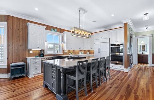 Nauti Time (formally Inverness) with a Private Pool - North End Pawleys Island, beautiful Marsh Views - This magnificent home on Pawleys Island has a private saltwater pool, sunset views of the creek and peeks of the ocean. Just a short walk to the beach, and conveniently located near a creekside boat landing, this home has all the charm of historic homes on Pawleys Island and all the modern conveniences you could want, including a whole house Halo 5 water filtration system. The main floor has 10ft ceilings and heart pine floors throughout. There is a bar area with an ice maker in the great room, and there are 2 sets of sliding glass doors that open to the extensive screened porch. The sizable, elevated pool is also on the main level and located off the great room. The outstanding kitchen has a 5-burner gas cooktop, double wall ovens, microwave drawer, two dishwashers, Sub-Zero refrigerator, and Quartz countertops and granite top on the island and breakfast bar. The main floor has two bedrooms, two baths and a half bath. One of the main floor bedrooms is a master suite with a king bed and a luxurious bath featuring double sinks and a large walk-in shower with double shower heads. Bedroom 2 on the main floor has a queen bed and a private bath with a tub/shower combination.