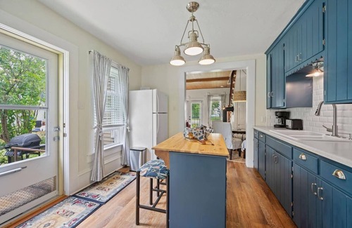 On the first level, you will find a fully equipped kitchen, small kitchen island (seats 2), round dining table (seats 4), living room with sleeper sofa, bedroom with queen-sized bed, bathroom with clawfoot tub/shower, and washer/dryer. Up the staircase to the second level, you will find a living space with a sleeper sofa, a bedroom with queen sized bed, and a bathroom with a shower. Fully equipped with cable TV and internet for your convenience.