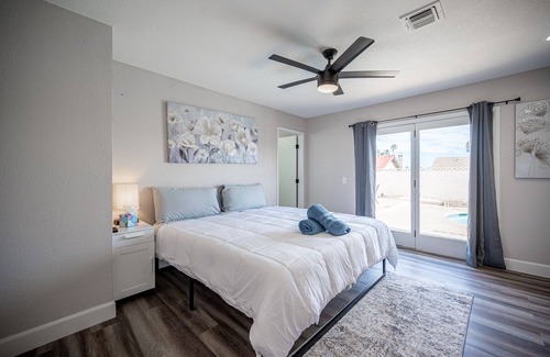 This special place is close to everything, making it easy to plan your visit. 8 Minutes away from Las Vegas Strip. Comes with a full kitchen, dining room, arcade, pool, jacuzzi, BBQ grill, outdoor dining area, corn-hole, large TVs. Great location nearby great places to eat, Casino, Sphere, Conventions. Ask about pool and spa heating for a fee!