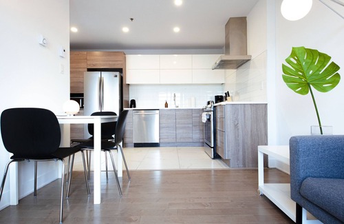 A hidden gem in a high-end building within proximity to Metro Vendome and 90 bus-stop right at the door, with upscale amenities: elevator, stair-free access, gym, indoor parking (with a fee) and an amazing rooftop terrace view. Apartments are bright and newly furnished with hand-picked modern furniture and top-quality appliances. Includes 1Gbps Wi-Fi, full kitchen, washer/dryer, modern shower and bathtub to guarantee you a relaxing and soothing stay.