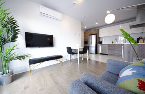 A hidden gem in a high-end building within proximity to Metro Vendome and 90 bus-stop right at the door, with upscale amenities: elevator, stair-free access, gym, indoor parking (with a fee) and an amazing rooftop terrace view. Apartments are bright and newly furnished with hand-picked modern furniture and top-quality appliances. Includes 1Gbps Wi-Fi, full kitchen, washer/dryer, modern shower and bathtub to guarantee you a relaxing and soothing stay.