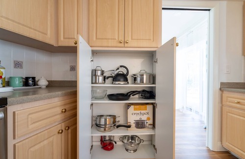 - fully stocked kitchen (toaster, coffee machine, blender, crockpot, baking sheet sets, pots, pans, silverware, wine and beer glasses, plates, cups, and more).