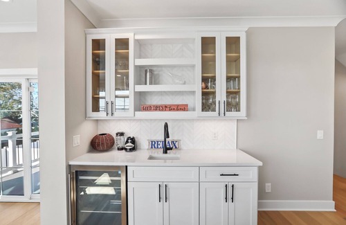 The 2nd floor of the beach house offers a gourmet kitchen with stainless steel LG appliances and white shaker cabinets with quartz counters and peninsula to enjoy your morning coffee. As you enter the family room/entertaining area you will be greeted comfy seating with a beautiful wet bar with wine cooler and built in TV and fireplace. A extra large dinning room table is perfect for family/group dinners. Outdoor covered deck extends the living space. This floor offers a half bath and the primary bedroom with walk-in closet that have been outfitted with custom drawers, shelves and cabinets. The main bath is large and spacious with a walk-in shower and double sink.