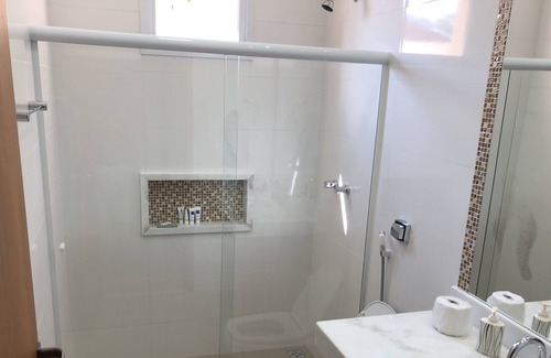 The house has three suites, 1 toilet, gourmet space with barbecue, TV room, dining room, equipped kitchen and air conditioning in all rooms.