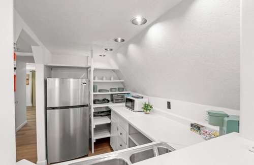 The upstairs unit features a kitchenette with full sized fridge, small appliances and coffee bar supplies. A second dining area is also right outside of the kitchenette next to the upstairs living room.