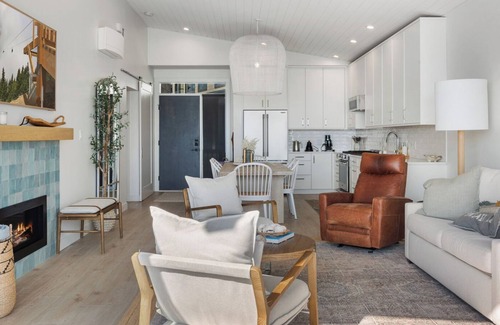 Soaring 14ft vaulted ceilings and breathtaking ocean views enhance the bright and airy open living space, which is thoughtfully designed, yet comfortable enough for families to relax and come together. The oversized kitchen boasts a gas range, fridge with ice maker, microwave, dishwasher and is fully stocked with the culinary essentials fit for a chef - additionally, a full-size gas BBQ sits on the deck for added convenience. Enjoy time together at one of two large tables that comfortably seat 8+, perfect for entertaining both inside and out. The living room features a comfortable American Leather queen-sized pull-out sleeper sofa which offers relaxation and versatility across from the eye-catching gas fireplace.