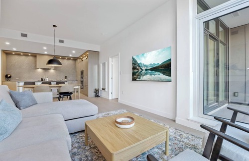 Enjoy this breathtaking escape elevated from the 2nd floor. The space boasts open concept kitchen & living areas with 10 ft ceilings and large floor to ceiling windows which provide tons of natural light. As one of the largest units in the boutique building, you'll have access to 1100 sqft of indoor and 800 sqft of outdoor living. The open concept kitchen is stocked with all new appliances and a wine fridge. The unit is easily accessible via elevator for seamless arrival and has one underground secured parking stall available for use. Parking has EV capability. The unit is professionally cleaned upon your arrival.